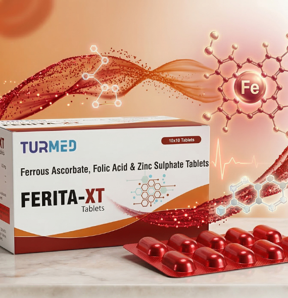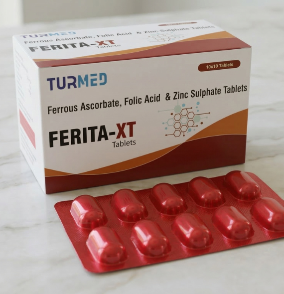 Ferita-XT Tablets are an iron supplement formulation containing Ferrous Ascorbate, Folic Acid, and Zinc Sulphate, designed to help manage iron deficiency and support healthy red blood cell production.