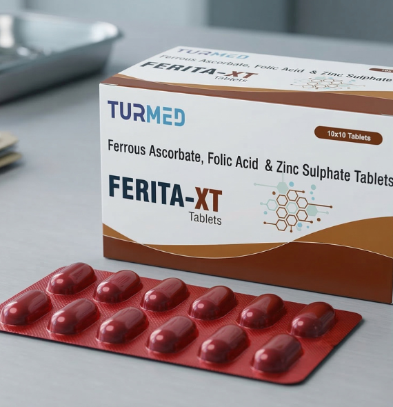 Ferita-XT Tablets are an iron supplement formulation containing Ferrous Ascorbate, Folic Acid, and Zinc Sulphate, designed to help manage iron deficiency and support healthy red blood cell production.